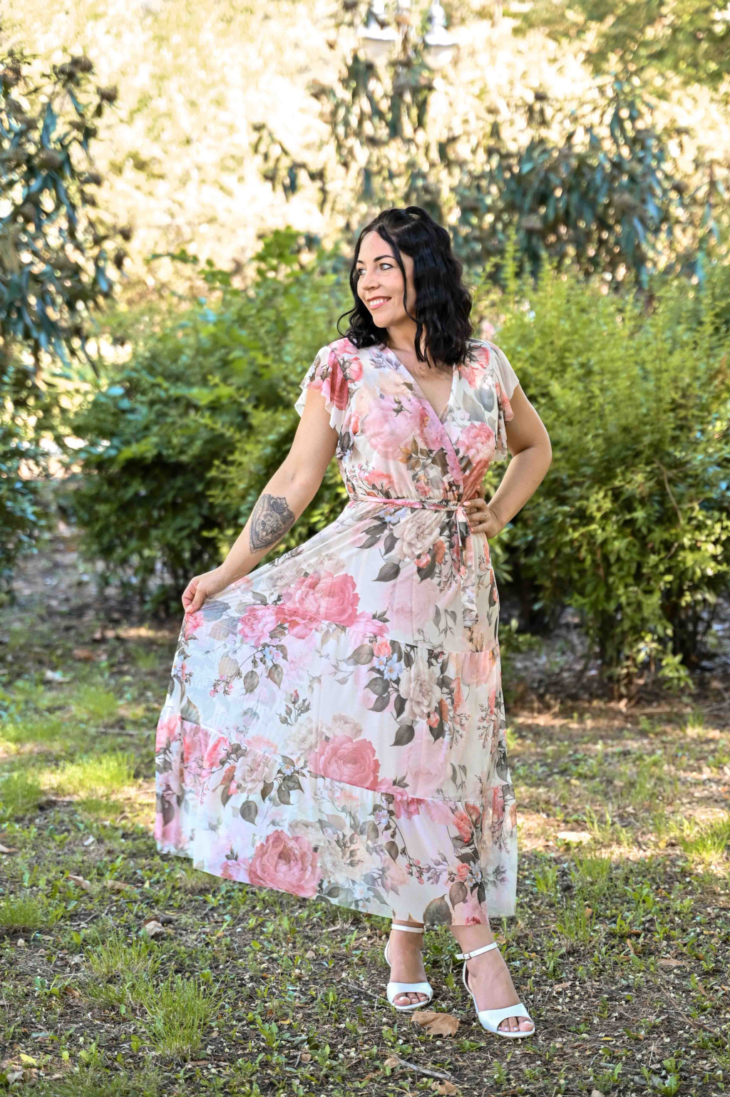 Fodros vállú virágmintás maxiruha övvel: Ez a bájos nyári maxiruha rövid ujjú, V nyakú szabással és fodros vállmegoldással készült. A mell alatt bővülő fazon kényelmes viseletet biztosít, az öv pedig hangsúlyozza a derekat. A virágmintás anyag romantikus hangulatot áraszt.