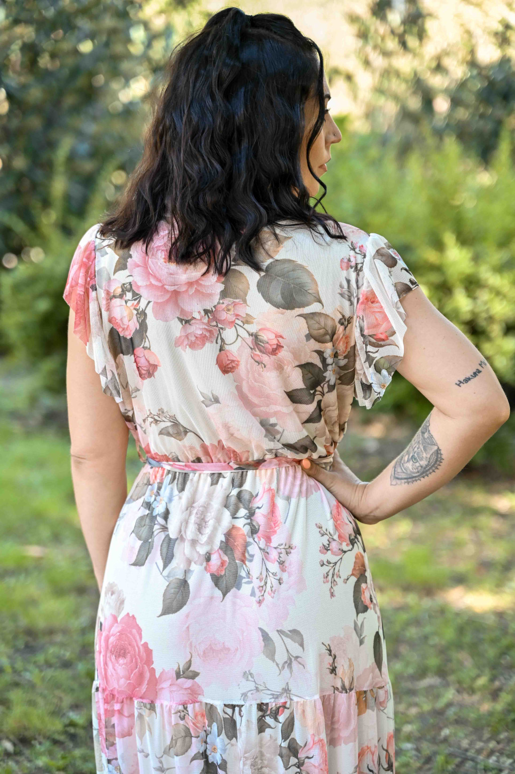 A fodros vállmegoldás és a rövid ujjak romantikus hangulatot kölcsönöznek ennek a virágmintás, maxihosszúságú ruhának. A V nyakú kivágás és a mell alatt bővülő szabás előnyösen emeli ki a nőies vonalakat, míg a saját mintás öv karcsúsítja a derekat. Tökéletes választás a hétköznapokra és különleges alkalmakra is.