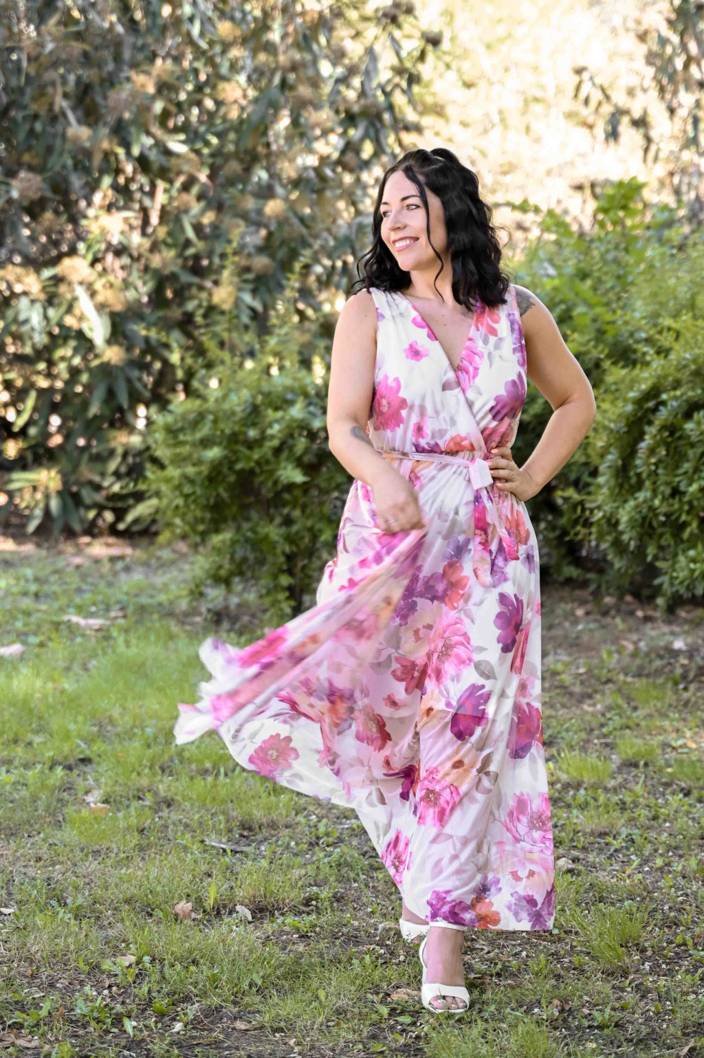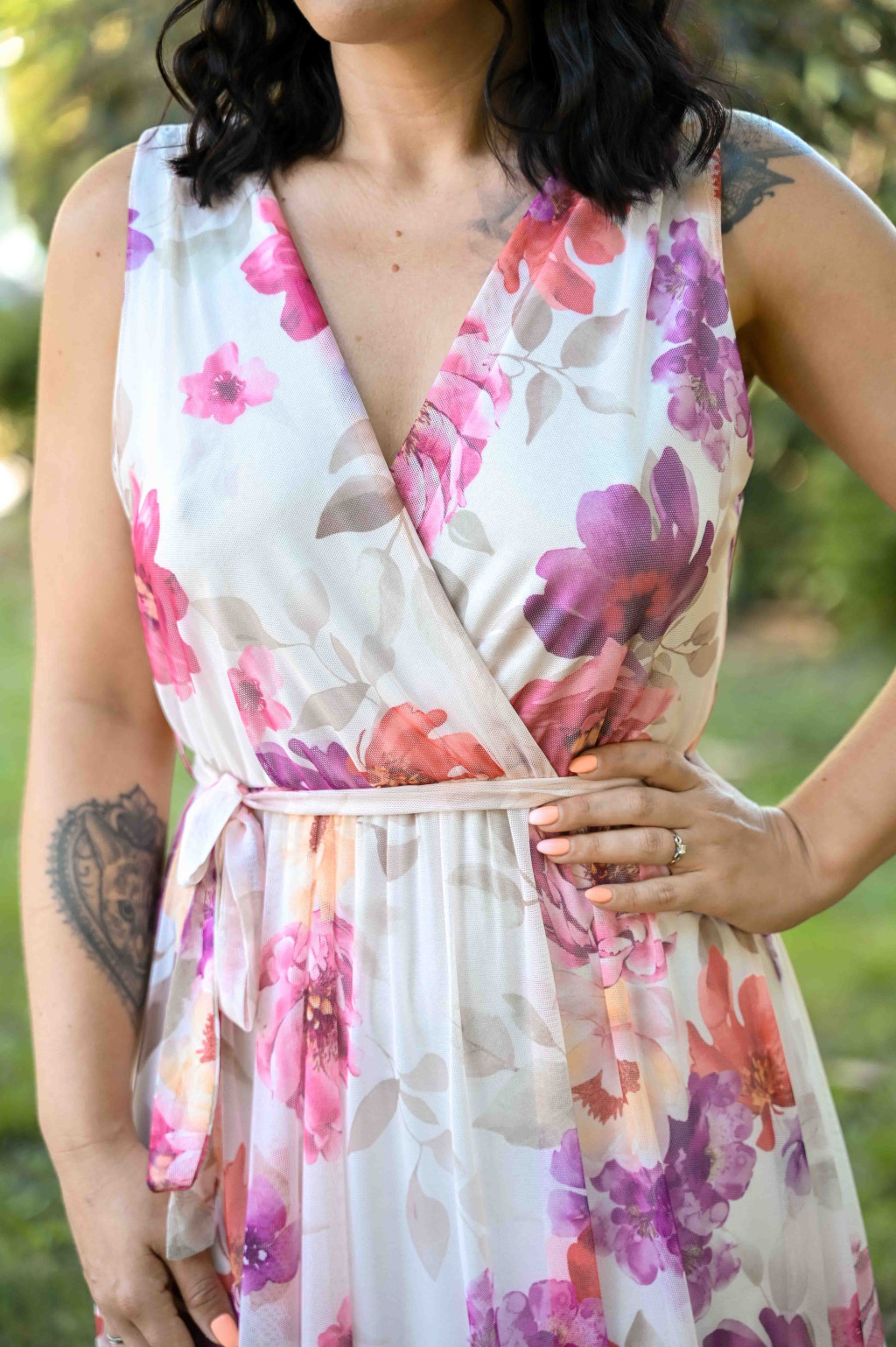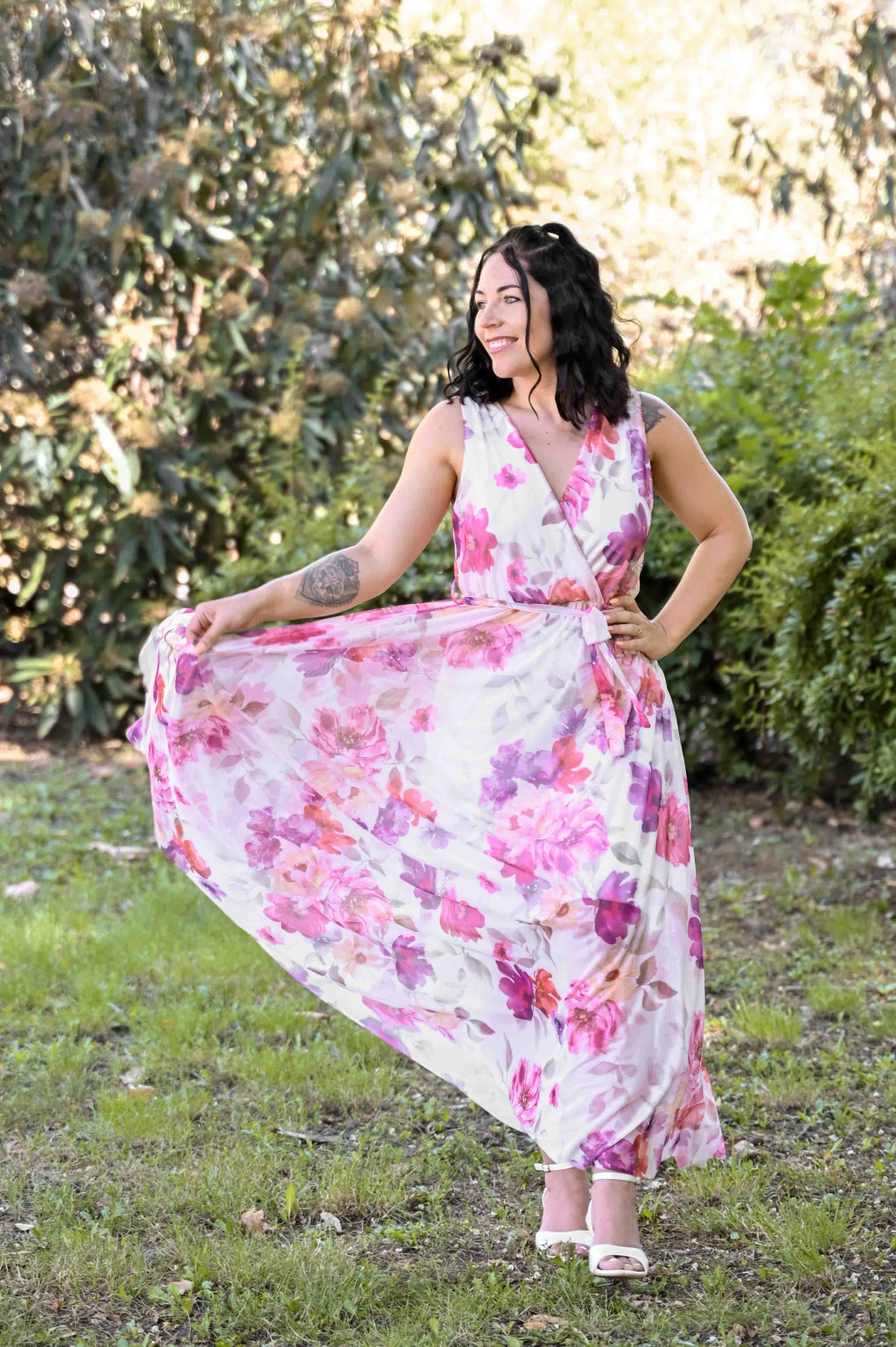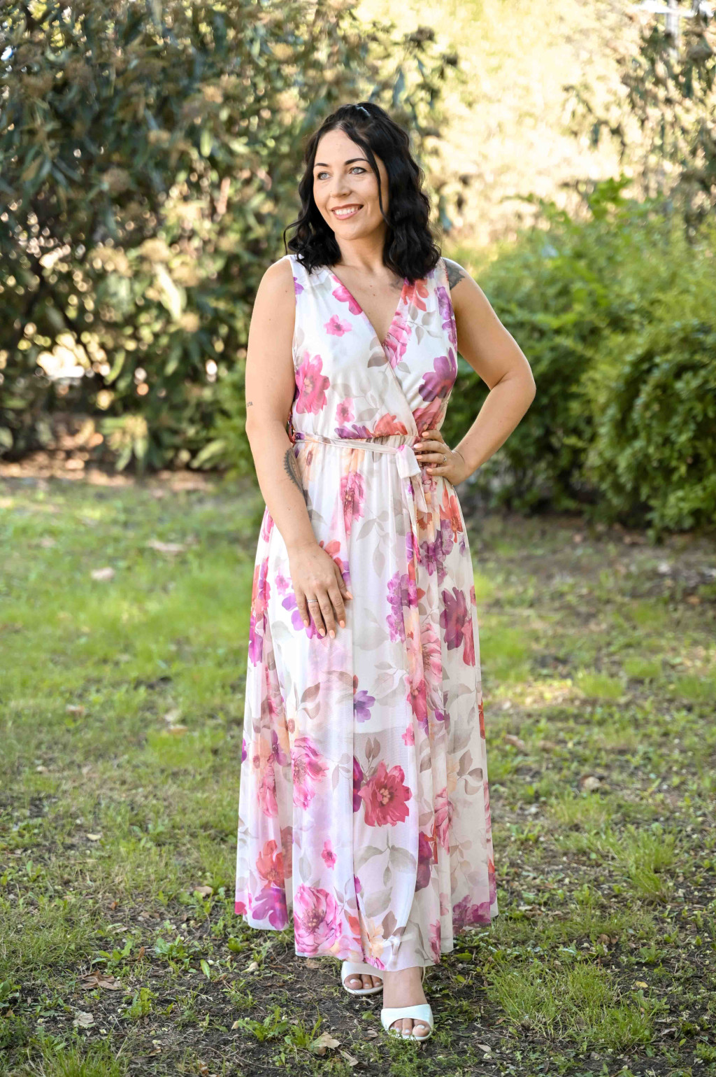 Ujjatlan virágmintás maxiruha saját övvel: Klasszikus női nyári ruha A-vonalú szabással, V kivágással és ujjatlan kialakítással. A derékrészt kiemeli a hozzá tartozó saját mintás öv, míg a virágos minta romantikus, könnyed megjelenést biztosít.