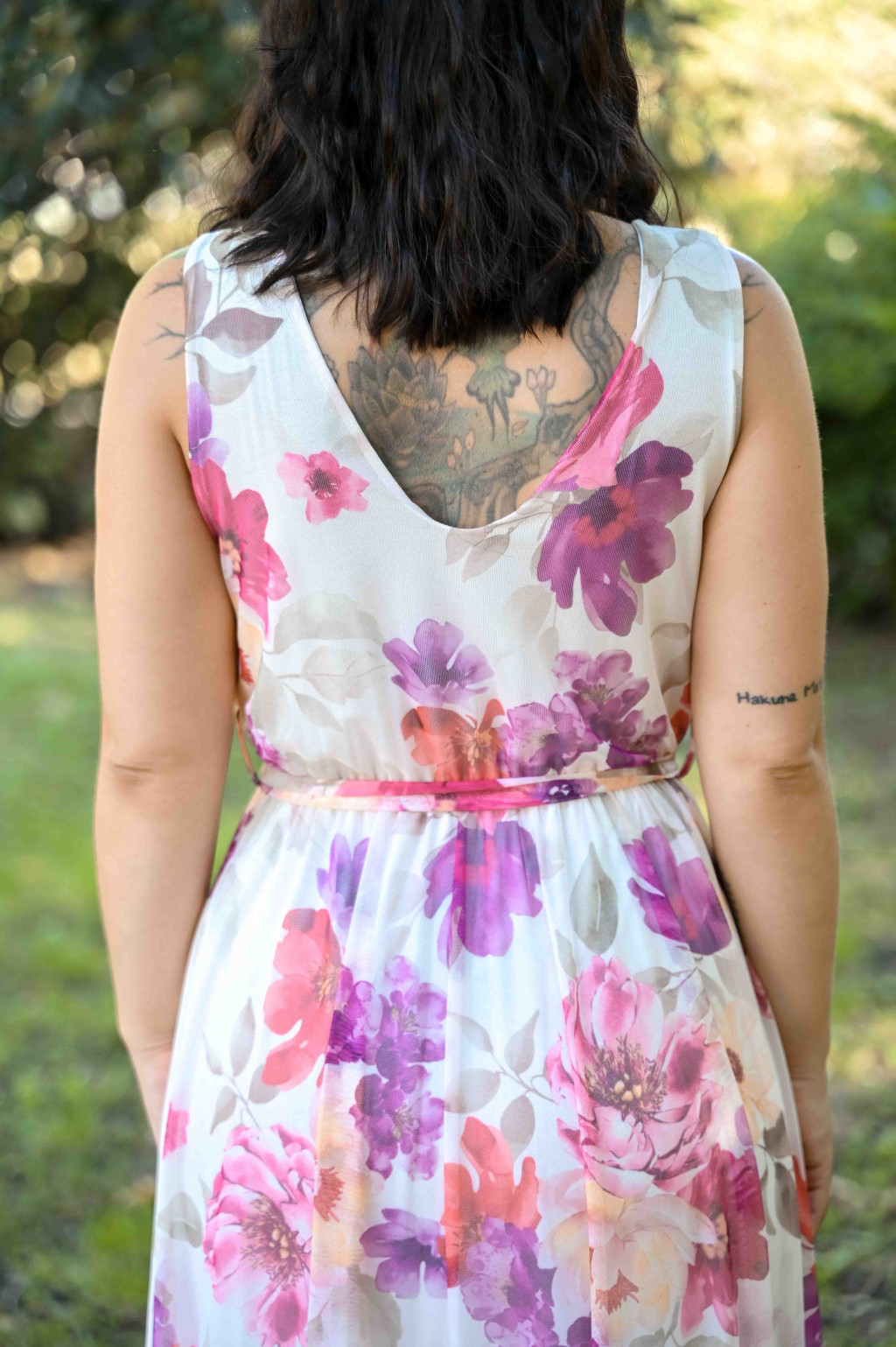 Ez a virágmintás, ujjatlan maxiruha letisztult, mégis látványos megjelenést kínál. Az A-vonalú szabás és a V nyakú kivágás elegánsan nyújtja az alakot, míg a saját mintás öv kiemeli a derekat. Könnyed anyaga miatt ideális meleg időben, munkahelyre vagy akár nyári rendezvényre is.