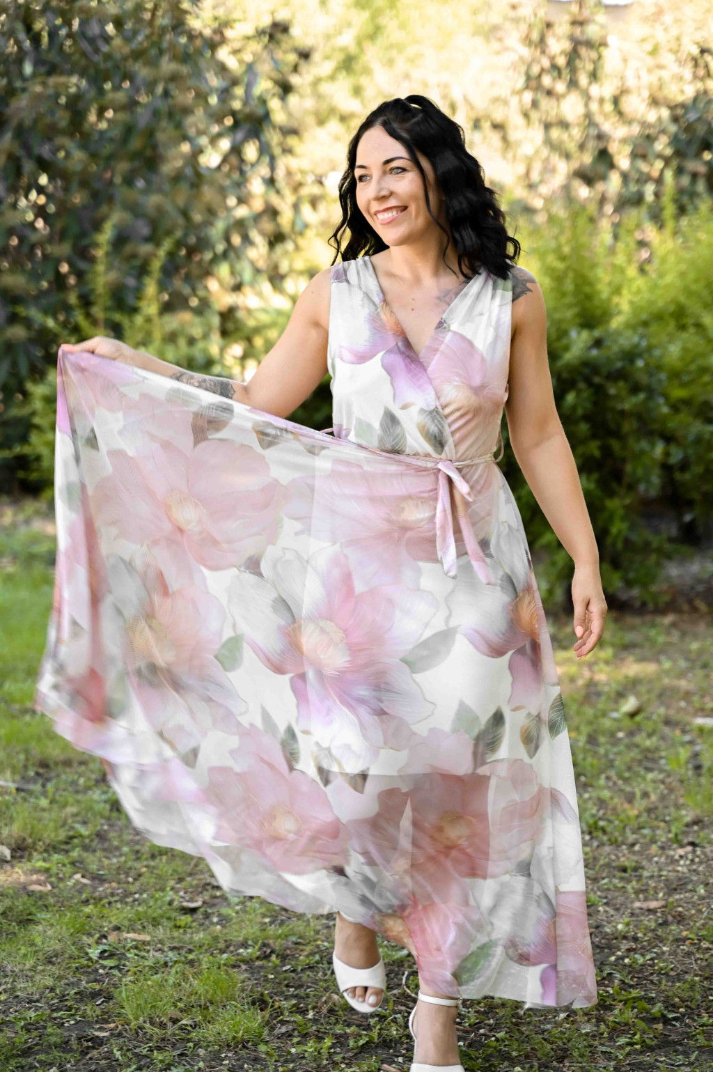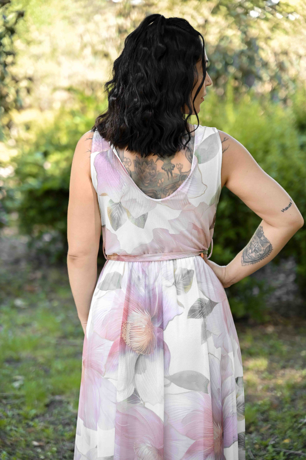 Ujjatlan virágmintás maxiruha saját övvel: Klasszikus női nyári ruha A-vonalú szabással, V kivágással és ujjatlan kialakítással. A derékrészt kiemeli a hozzá tartozó saját mintás öv, míg a virágos minta romantikus, könnyed megjelenést biztosít.
