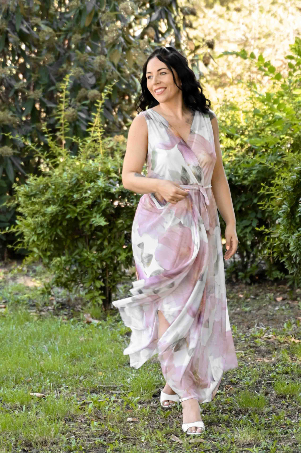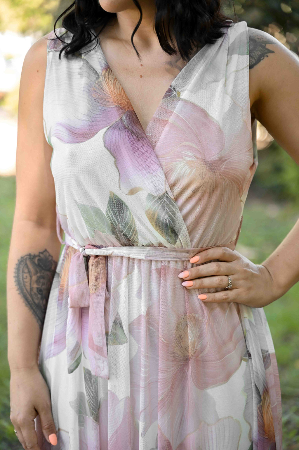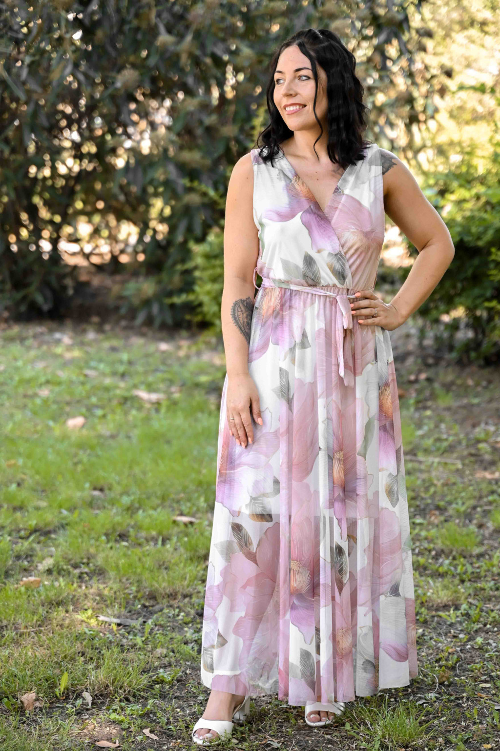 Ez a virágmintás, ujjatlan maxiruha letisztult, mégis látványos megjelenést kínál. Az A-vonalú szabás és a V nyakú kivágás elegánsan nyújtja az alakot, míg a saját mintás öv kiemeli a derekat. Könnyed anyaga miatt ideális meleg időben, munkahelyre vagy akár nyári rendezvényre is.