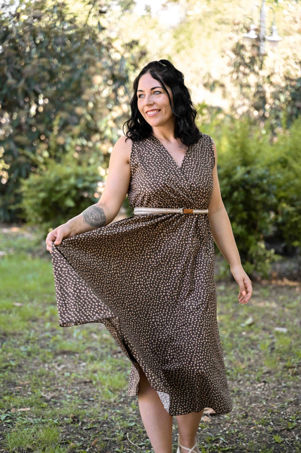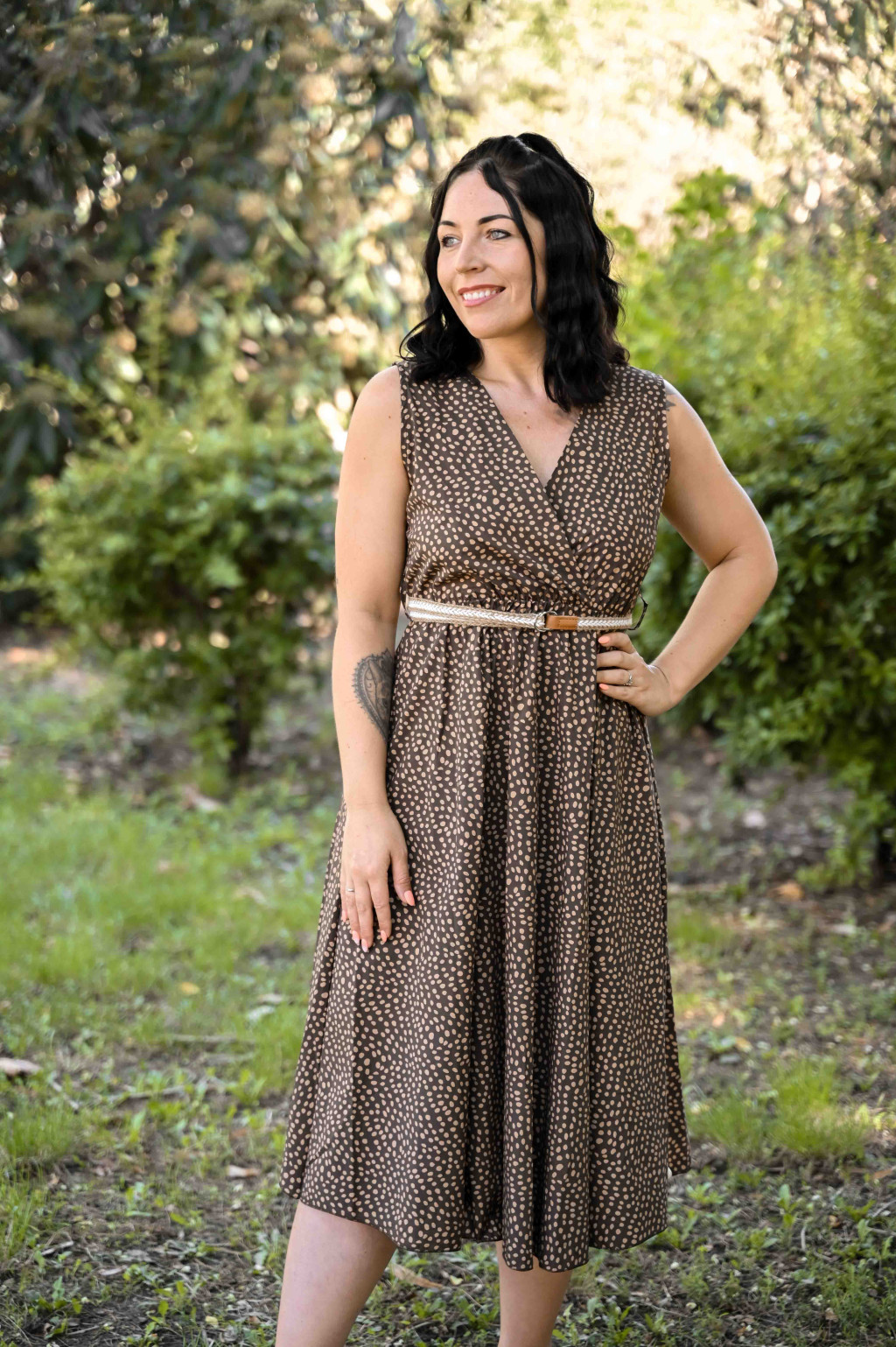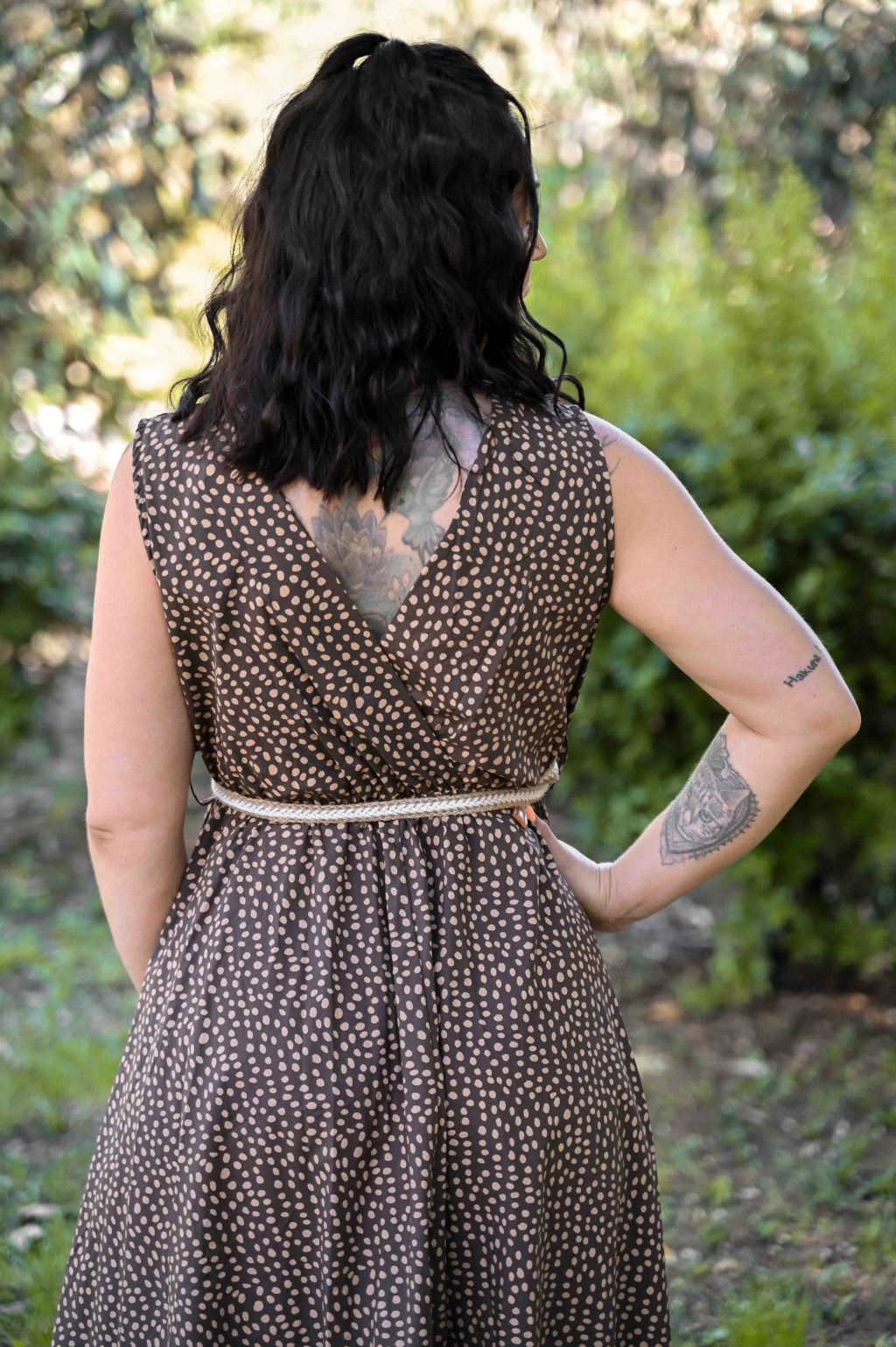 Ez az aprópöttyös, ujjatlan vászonruha a természetes anyagok kedvelőinek ideális választás. A V nyakú kivágás és az A-vonalú midi szabás kellemes összhatást kelt, a fonott öv pedig bohém hangulatot visz a megjelenésbe. Remek választás a forró nyári napokra, akár városban, akár kiránduláson viselve.