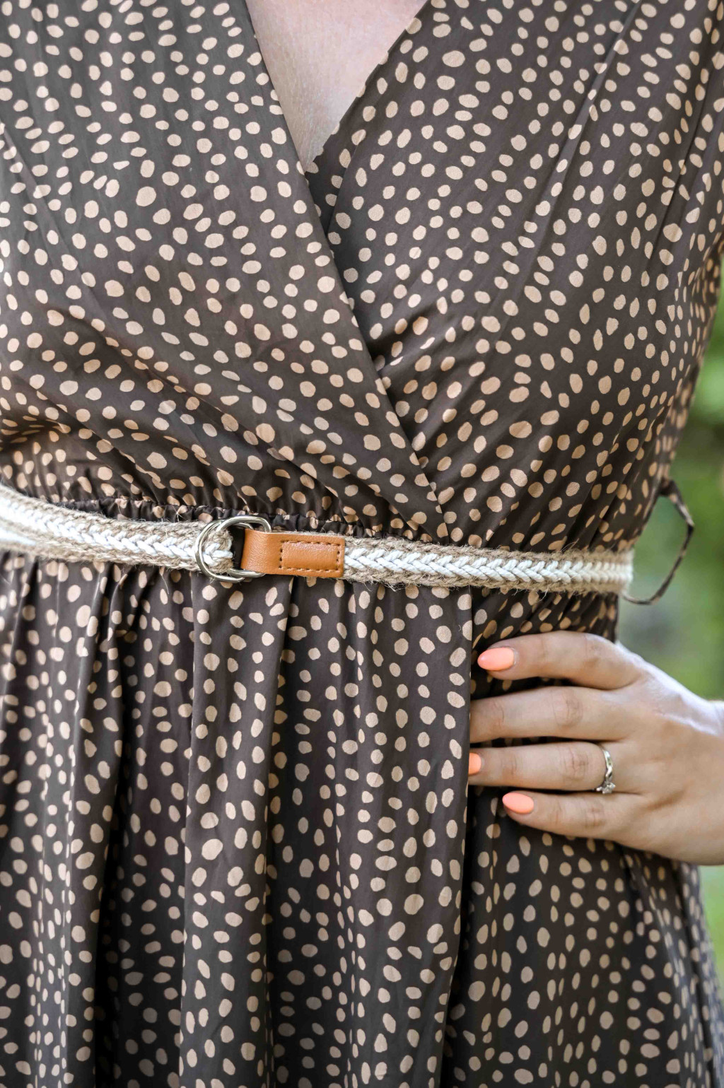 Kialakítás: V nyakú, aprópöttyös mintás, fonott övvel