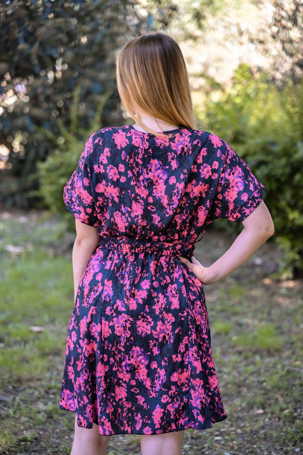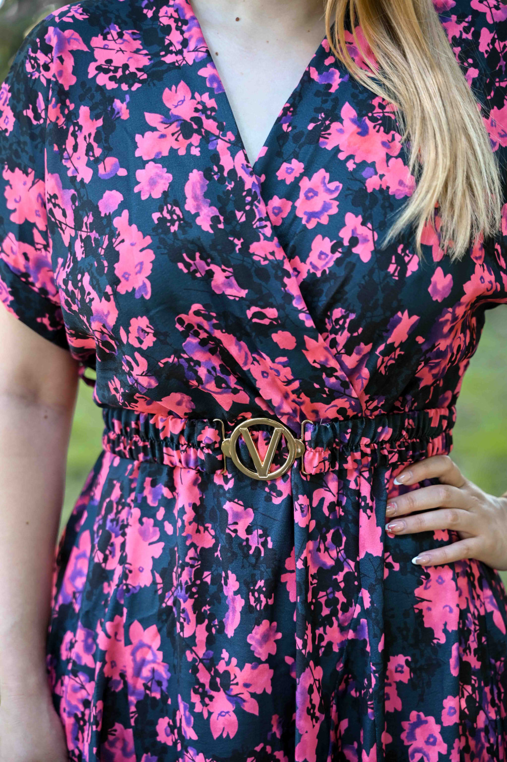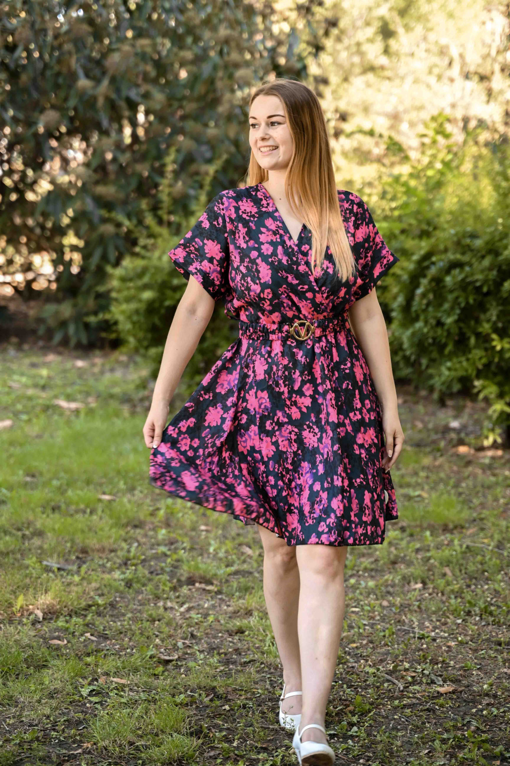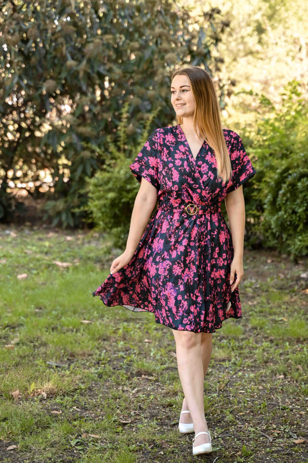 Ez a színes mintás, rövid ujjú ruha kényelmes mégis csinos választás a mindennapokra. A V nyakú kivágás nőies megjelenést ad, a térdig érő hossz pedig elegánsan takar. A saját öv hangsúlyozza a derekat, míg az A-vonalú szabás minden testalkaton jól mutat.