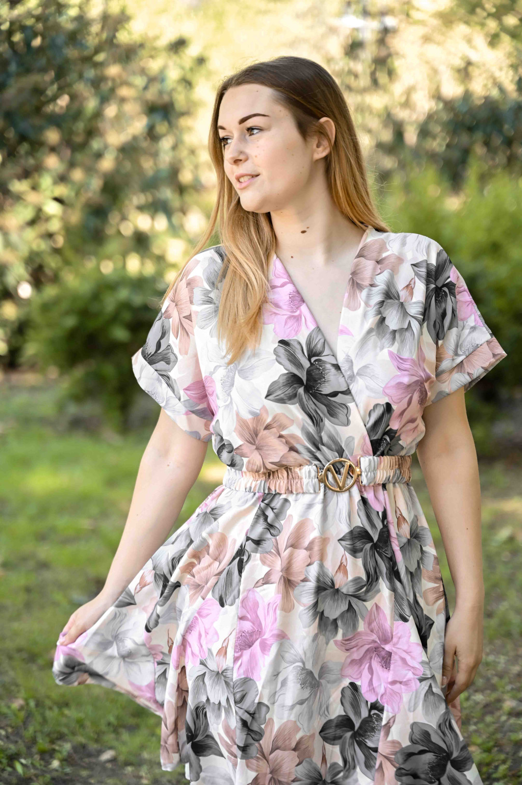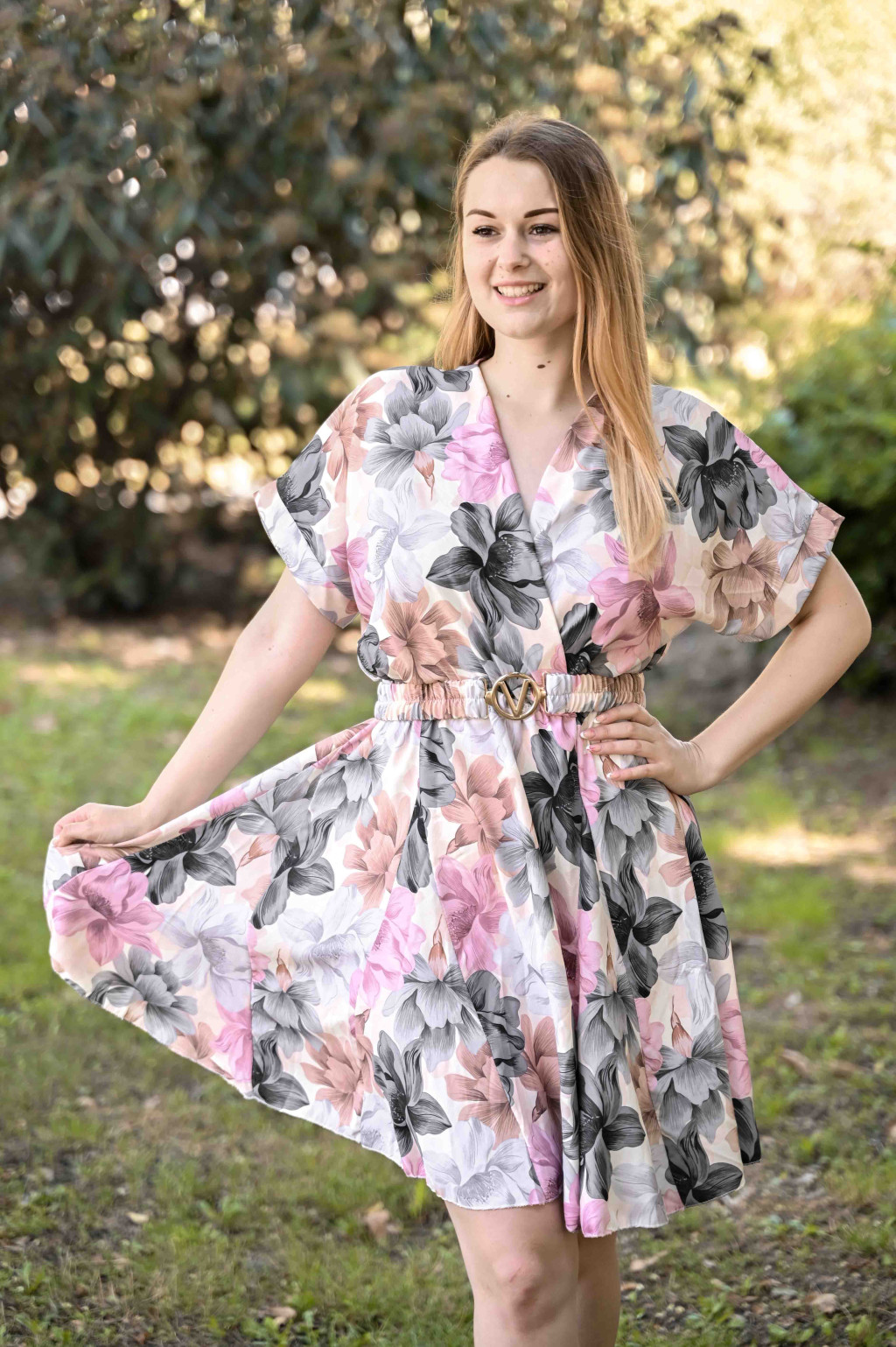 Ez a színes mintás, rövid ujjú ruha kényelmes mégis csinos választás a mindennapokra. A V nyakú kivágás nőies megjelenést ad, a térdig érő hossz pedig elegánsan takar. A saját öv hangsúlyozza a derekat, míg az A-vonalú szabás minden testalkaton jól mutat.