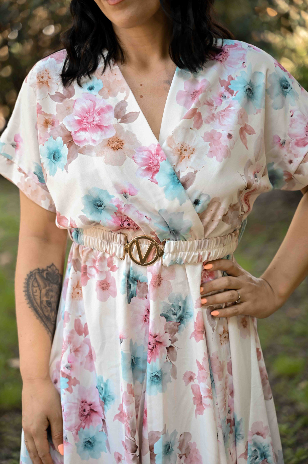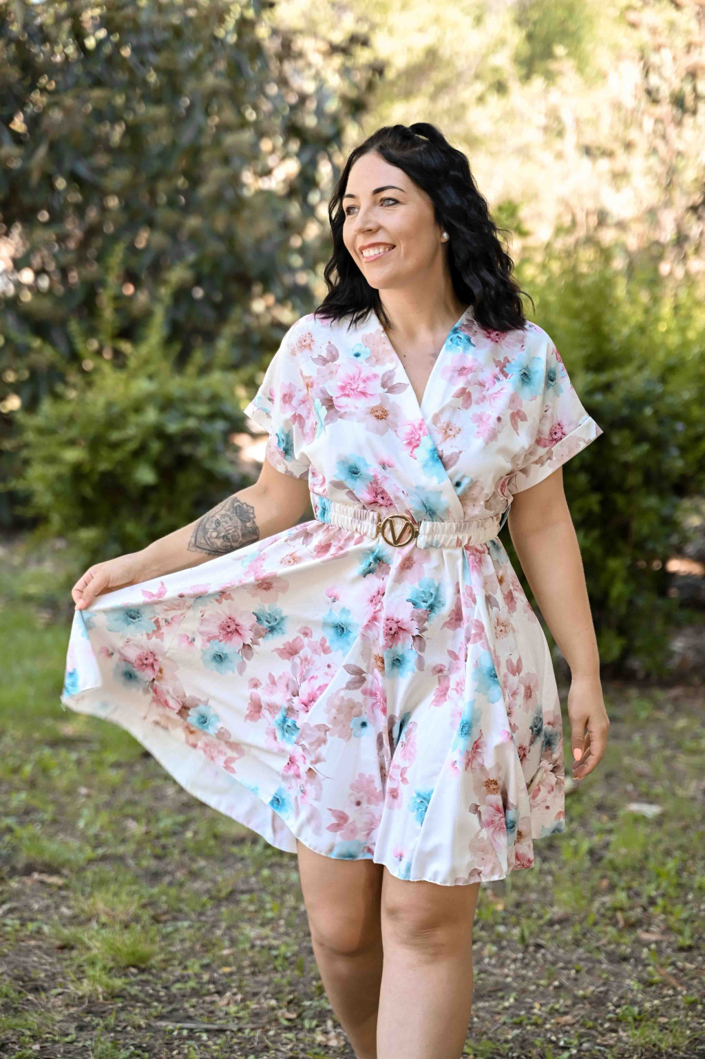 Rövid ujjú, V nyakú színes mintás nyári ruha: Ez az élénk női ruha kényelmes, térdig érő hosszúsággal és klasszikus A-vonalú szabással készült. A V nyakú felsőrész és a színes mintázat játékos és nőies megjelenést ad, míg az öv kihangsúlyozza a derekat.