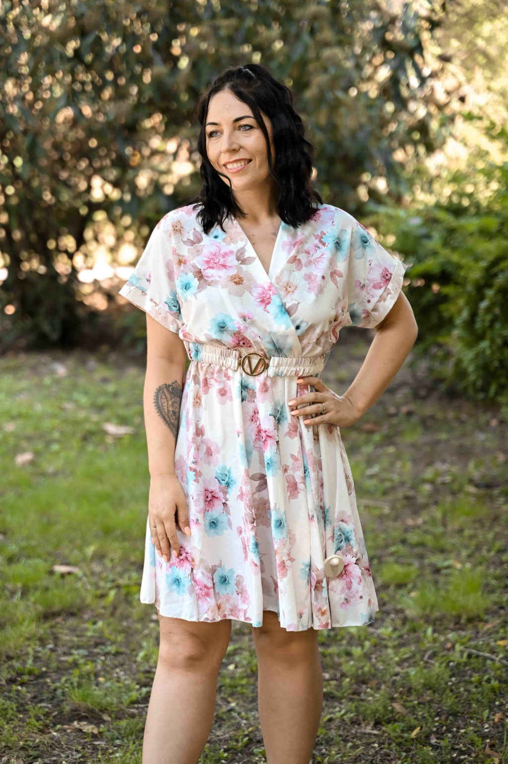 Ez a színes mintás, rövid ujjú ruha kényelmes mégis csinos választás a mindennapokra. A V nyakú kivágás nőies megjelenést ad, a térdig érő hossz pedig elegánsan takar. A saját öv hangsúlyozza a derekat, míg az A-vonalú szabás minden testalkaton jól mutat.