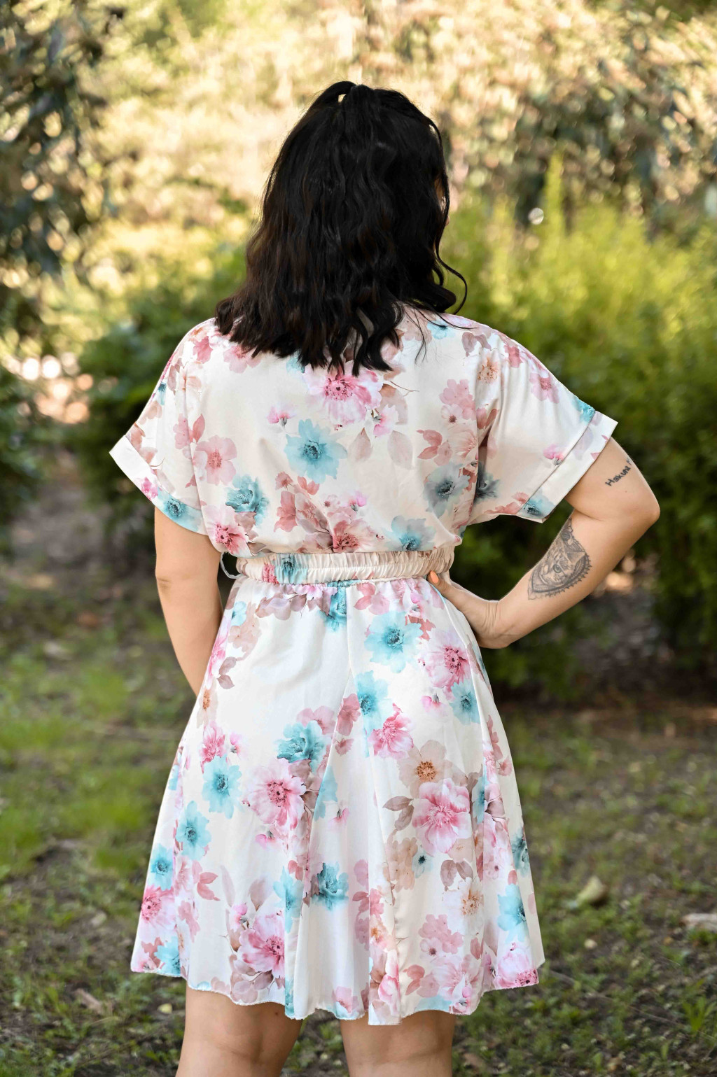 rövid ujjú fodros miniruha övvel rózsaszín kék