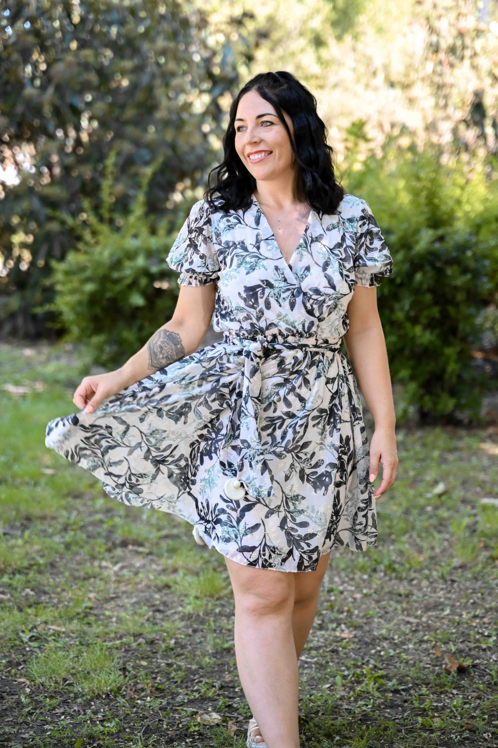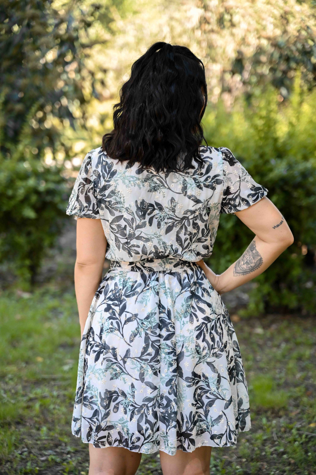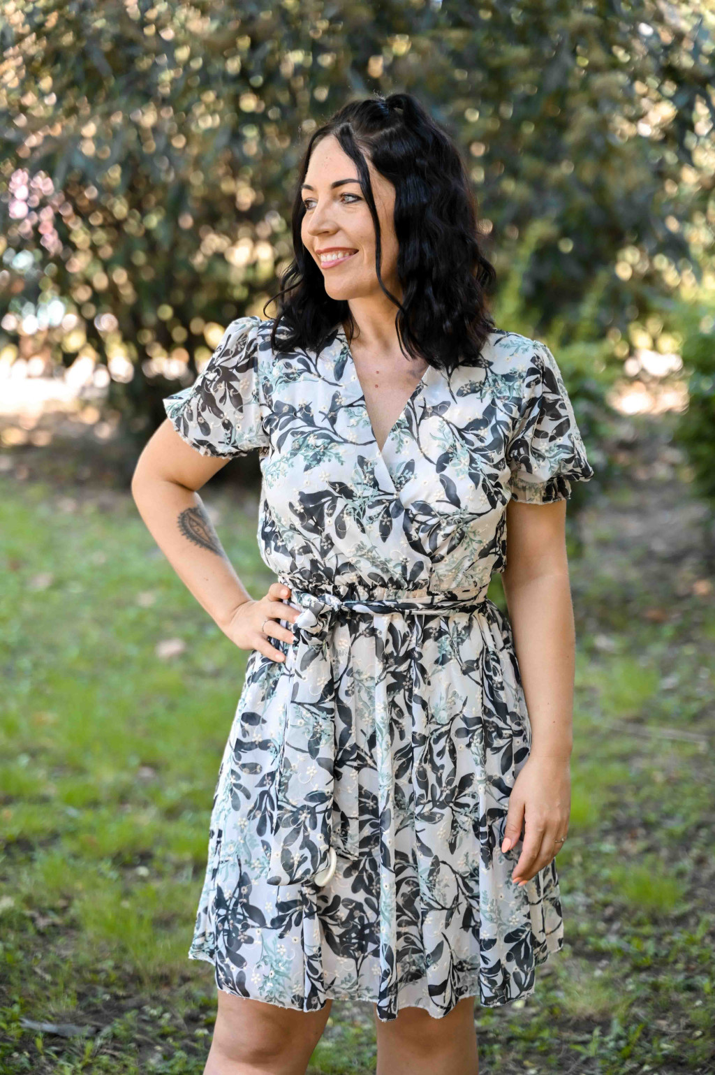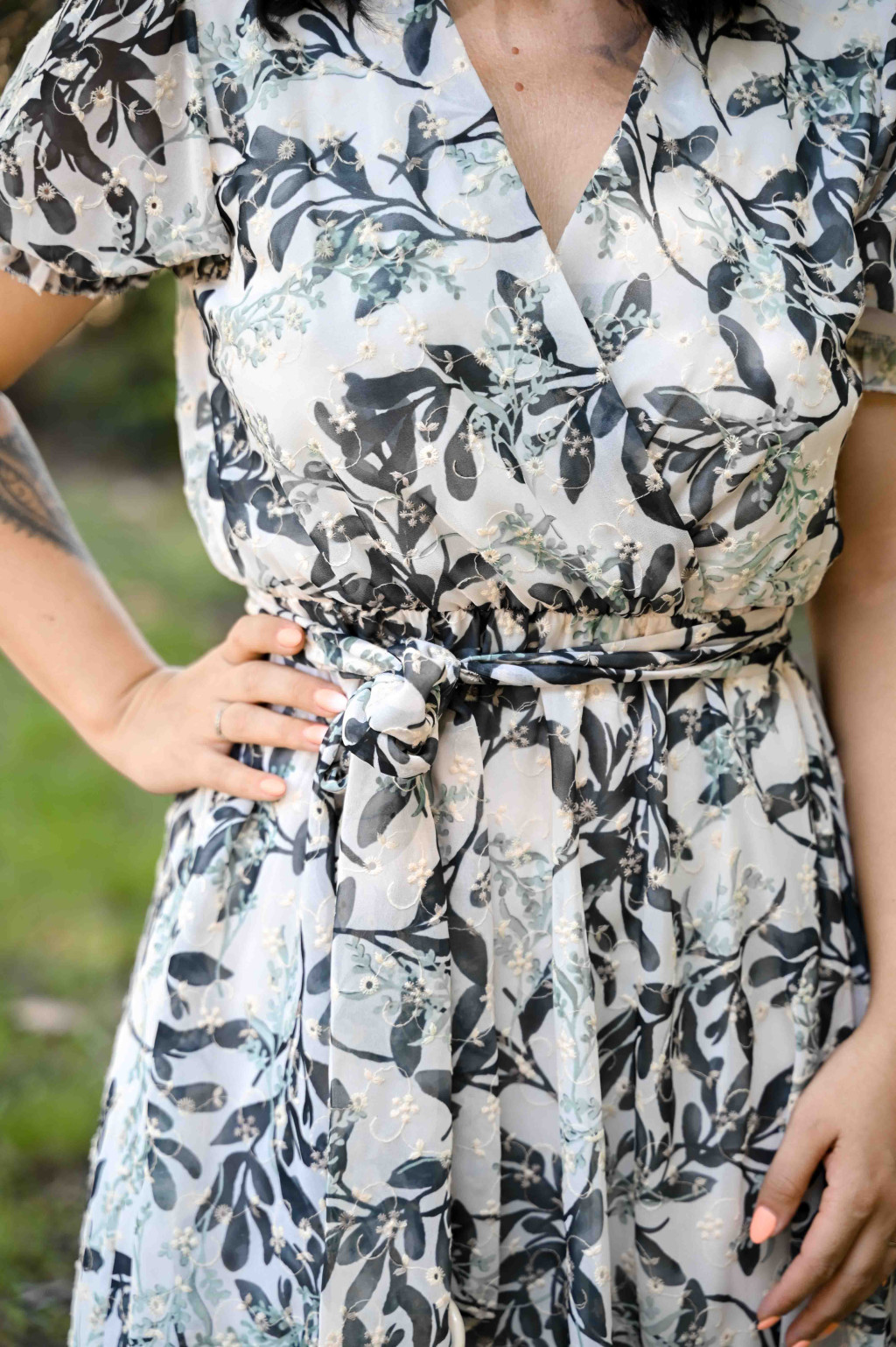 Ez a rövid ujjú, mintás miniruha tökéletes a meleg nyári napokra. A V nyakú kialakítás és az A-vonalú szabás kellemes összhangban van a könnyed anyaggal, míg a saját mintás öv hangsúlyozza a nőies alakot. Jól kombinálható szandállal vagy sportcipővel, így minden alkalomra stílusos választás.