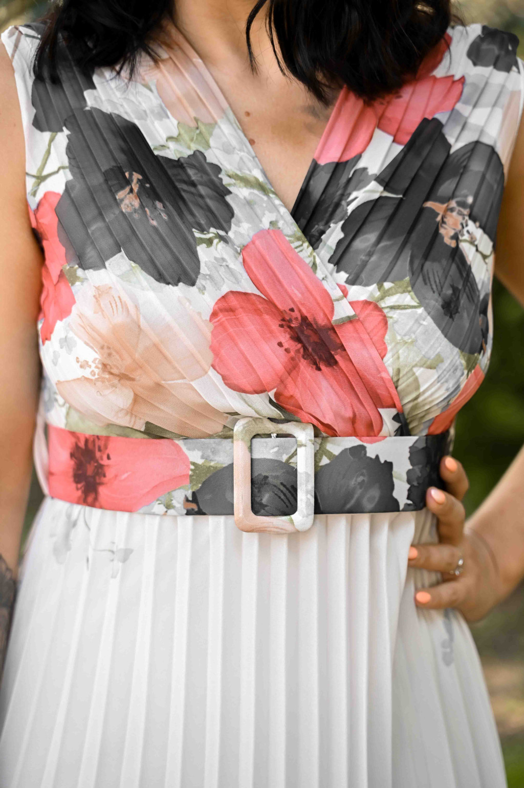 Ujjatlan plisszírozott virágmintás maxiruha övvel: Ez az elegáns női nyári ruha ujjatlan, V nyakú kialakításával és finom plisszírozott szoknyarészével igazán nőies megjelenést nyújt. A mell alatt húzott szabás és az öv kiemeli a derékvonalat, míg a földig érő hossz miatt tökéletes választás alkalmakra is.