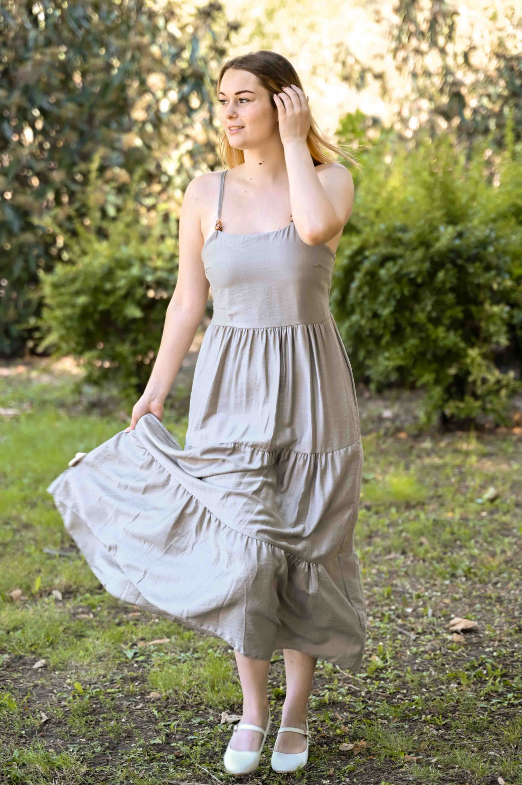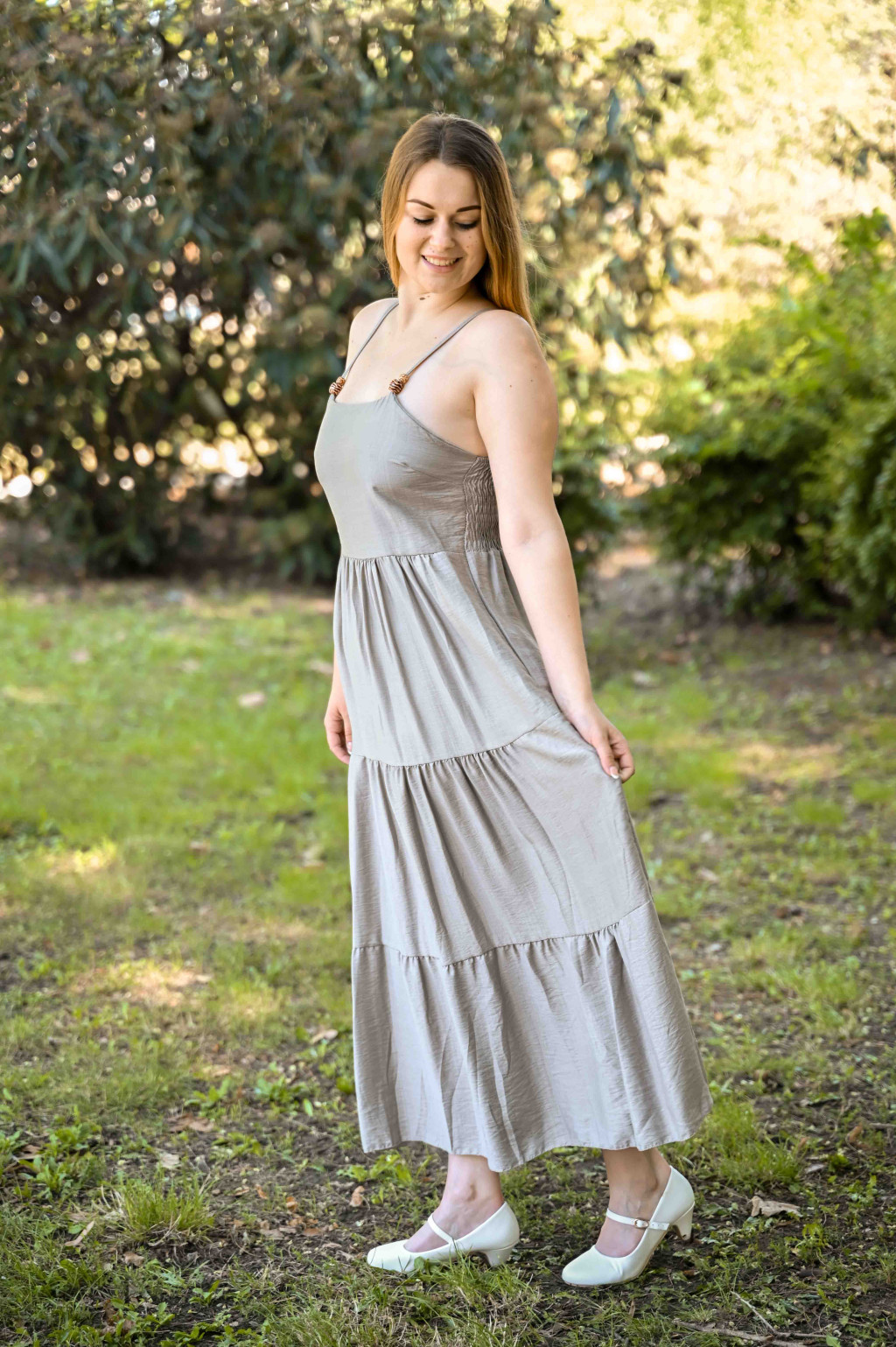 Ez az egyszínű, spagettipántos maxiruha fagyöngy díszítéssel a természetesség és az egyszerű elegancia tökéletes egyensúlya. A hátul gumírozott kialakítás kényelmet biztosít, a mell alatt bővülő szabás pedig könnyed mozgást tesz lehetővé. Ideális nyaralásra, tengerparti sétákhoz vagy városi nyári napokra.